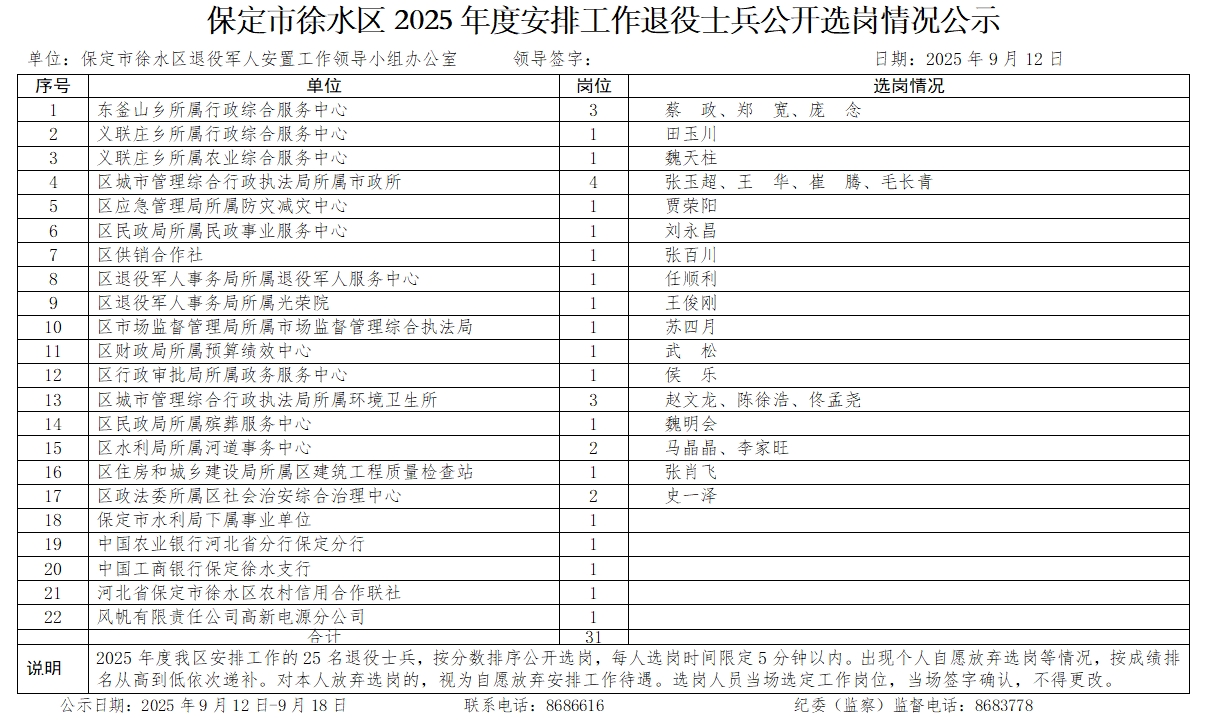 根据《保定市徐水区2025年度退役军人安置方案》,9月12日,我们组织召开了由组织部、纪委监委、人武部、编办、退役军人事务局、人社局、财政局等部门参加的2025年度徐水区安排工作退役士兵公开选岗大会,参加选岗人数25人,共提供区直部门及乡镇下属事业单位岗位26个、市直单位下属差额事业单位岗位1个,提供中央企业岗位3个,省属企业岗位1个,现将选岗结果公示如下(详见附件)。